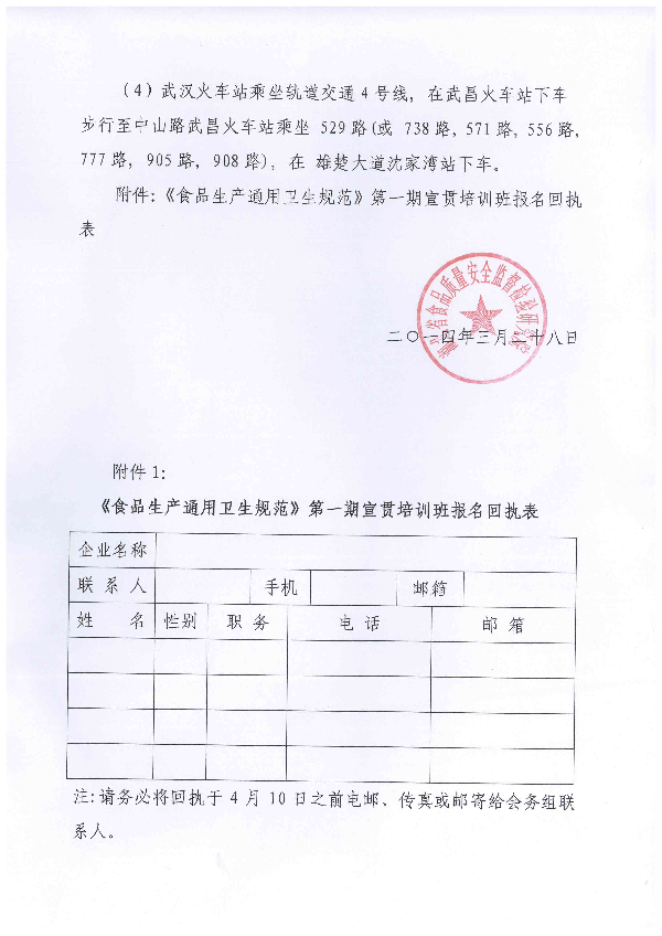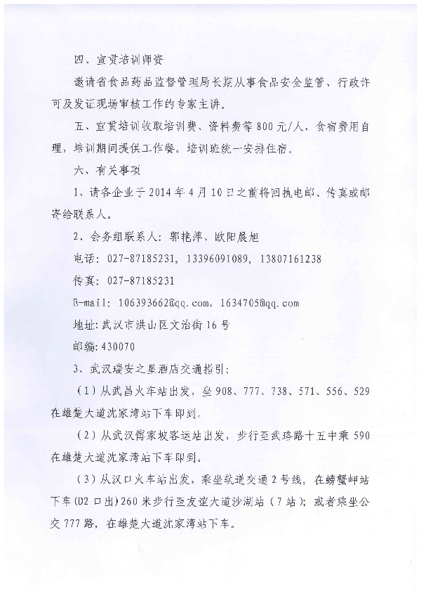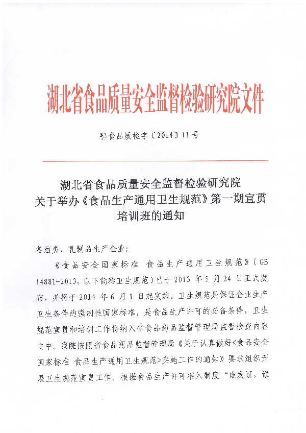 湖北省食品质量安全监督检验研究院关于举办《食品生产通用卫生规范》第一期宣贯培训班的通知