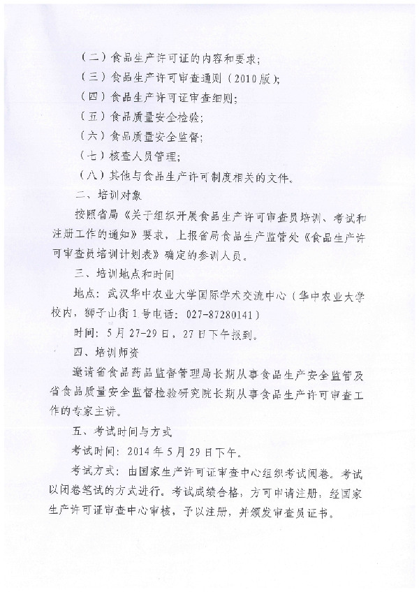 湖北省食品质量安全监督检验研究院关于组织开展食品生产许可证审查员培训考试的通知