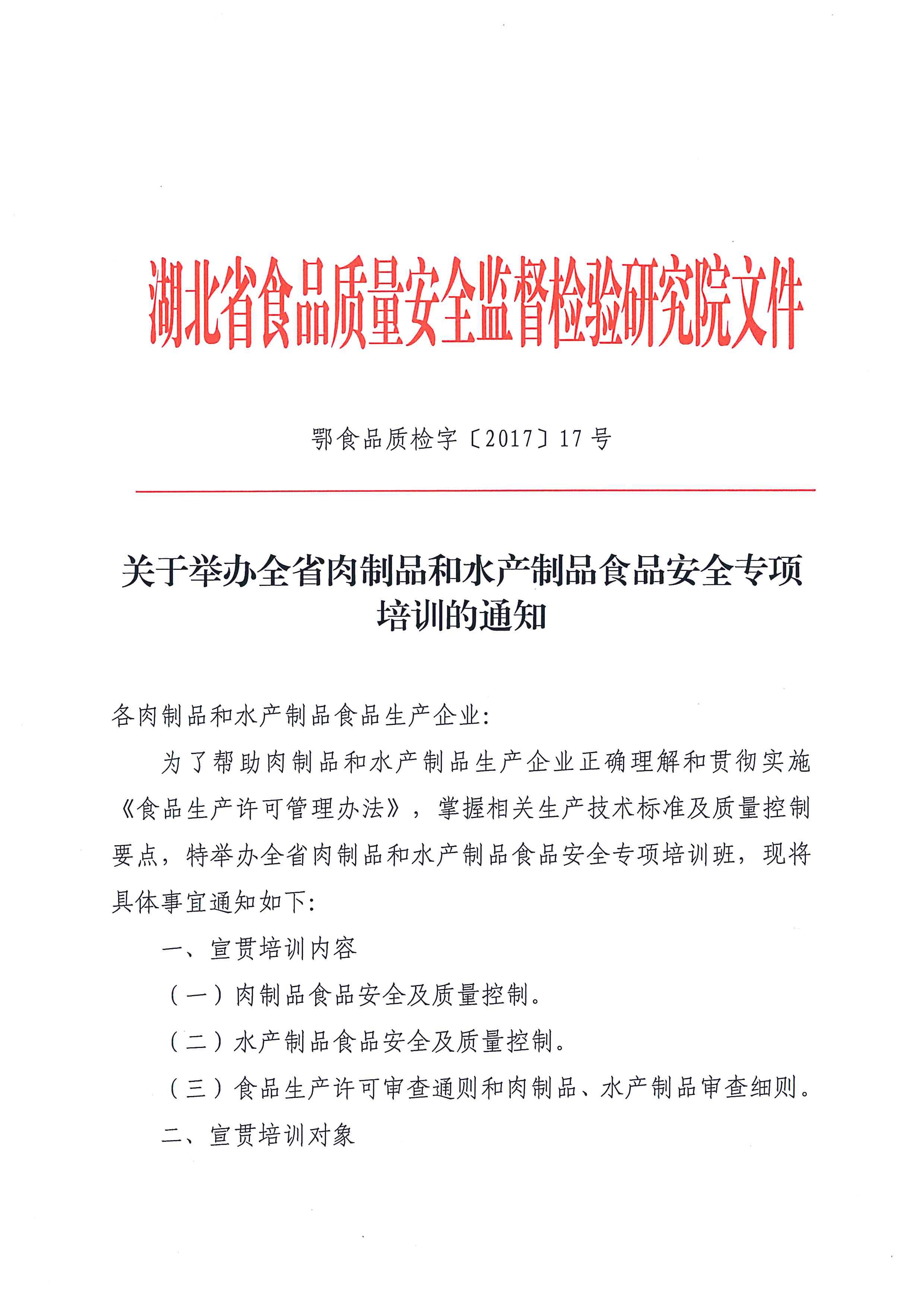 关于举办全省肉制品和水产制品食品安全专项培训的通知