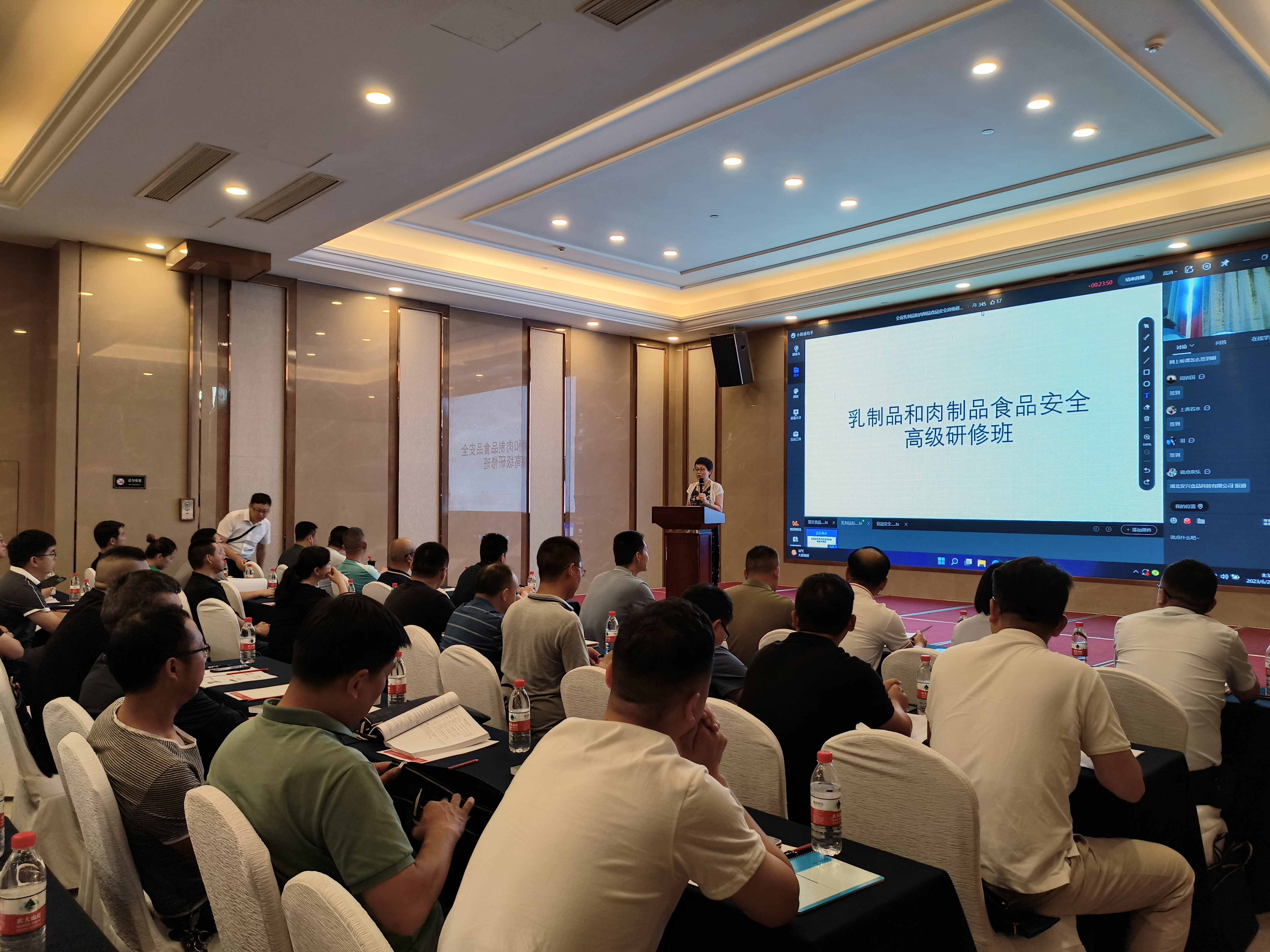 6月27-29日,省食检院举办了全省乳制品和肉制品高级研修班,来自全省各地的一百多家乳制品和肉制品企业的食品安全总监和质量负责人(共120余人)参加了本次研修学习。为满足因名额限制不能参加线下学习的其他企业人员需求,本次研修班同时开展了线上直播,期间直播间访客数达385人,浏览量2059人次。