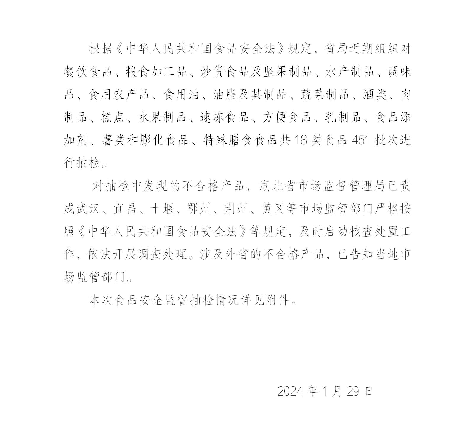 湖北省市场监督管理局 食品安全监督抽检信息公告(2024年第2期)