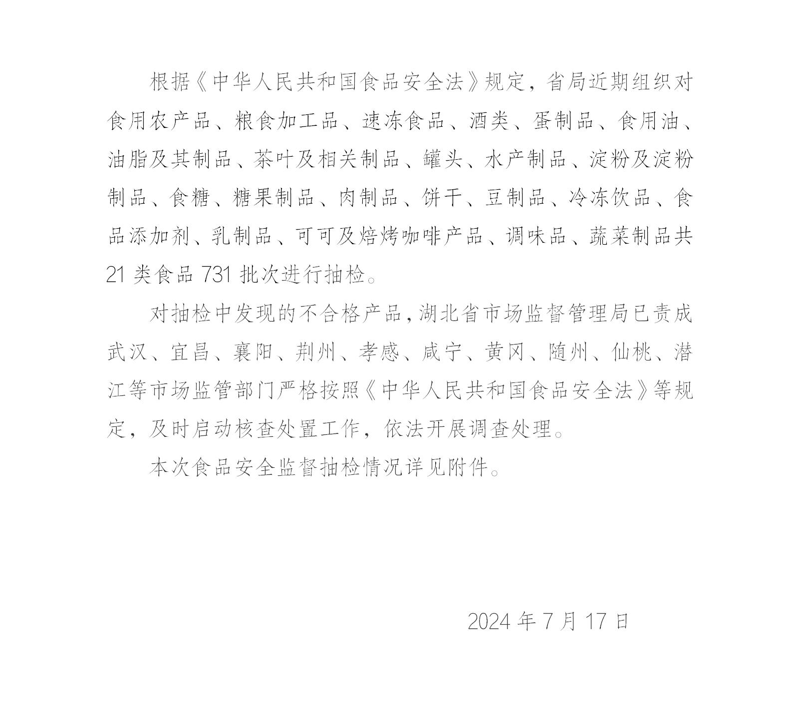 湖北省市场监督管理局 食品安全监督抽检信息公告(2024年第10期)