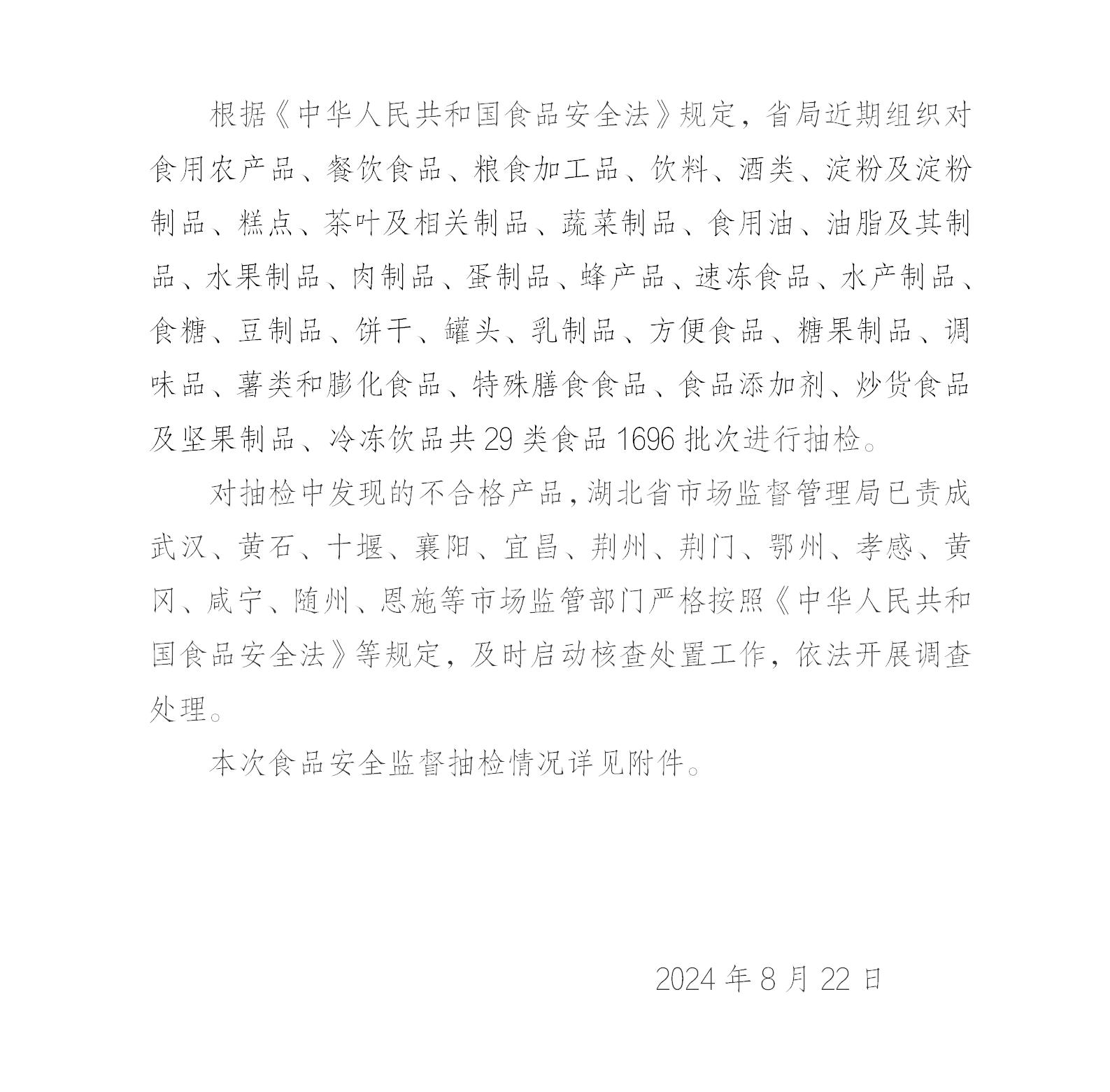湖北省市场监督管理局 食品安全监督抽检信息公告(2024年第13期)