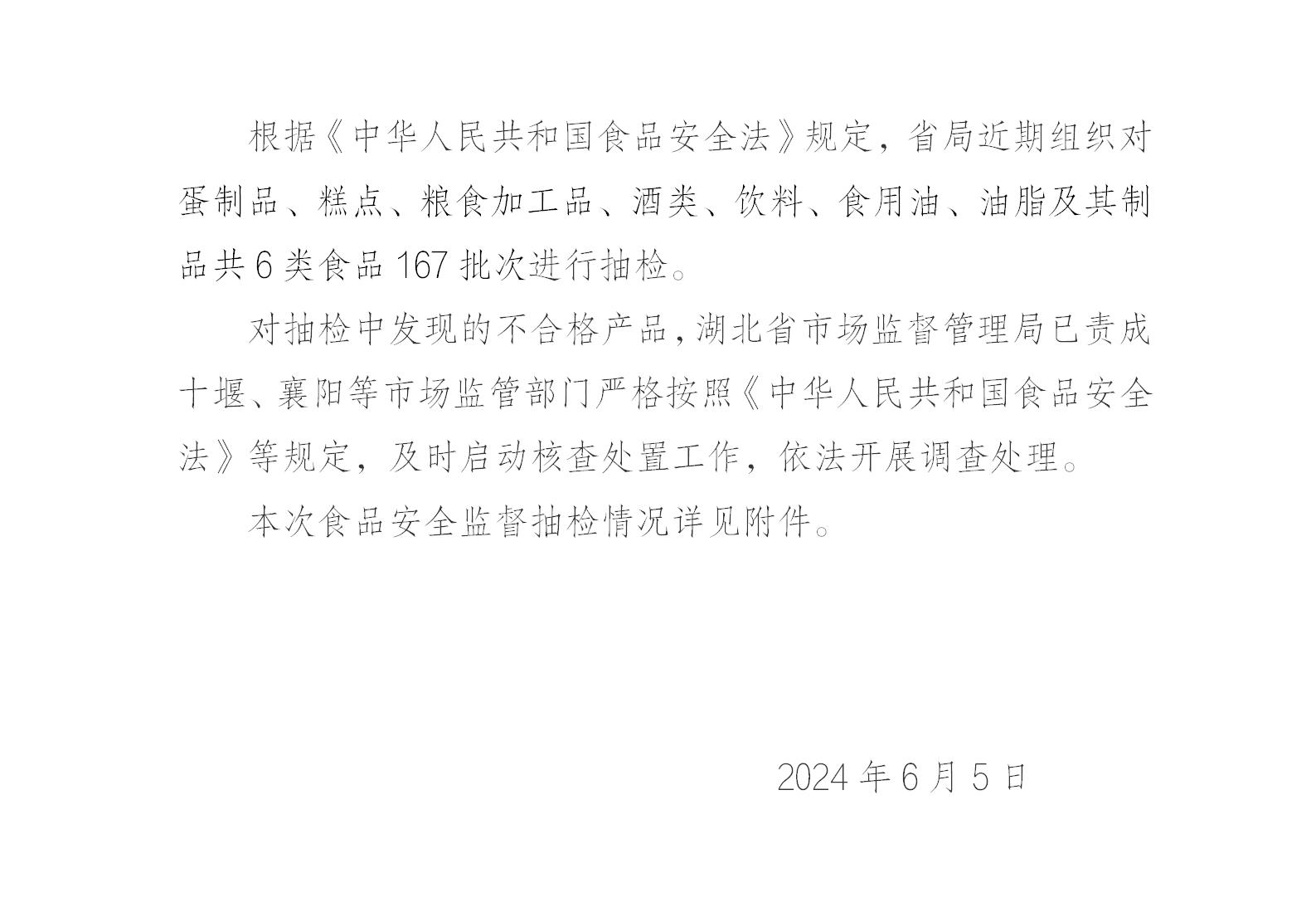 湖北省市场监督管理局 端午节令食品安全监督抽检信息公告(2024年第6期)