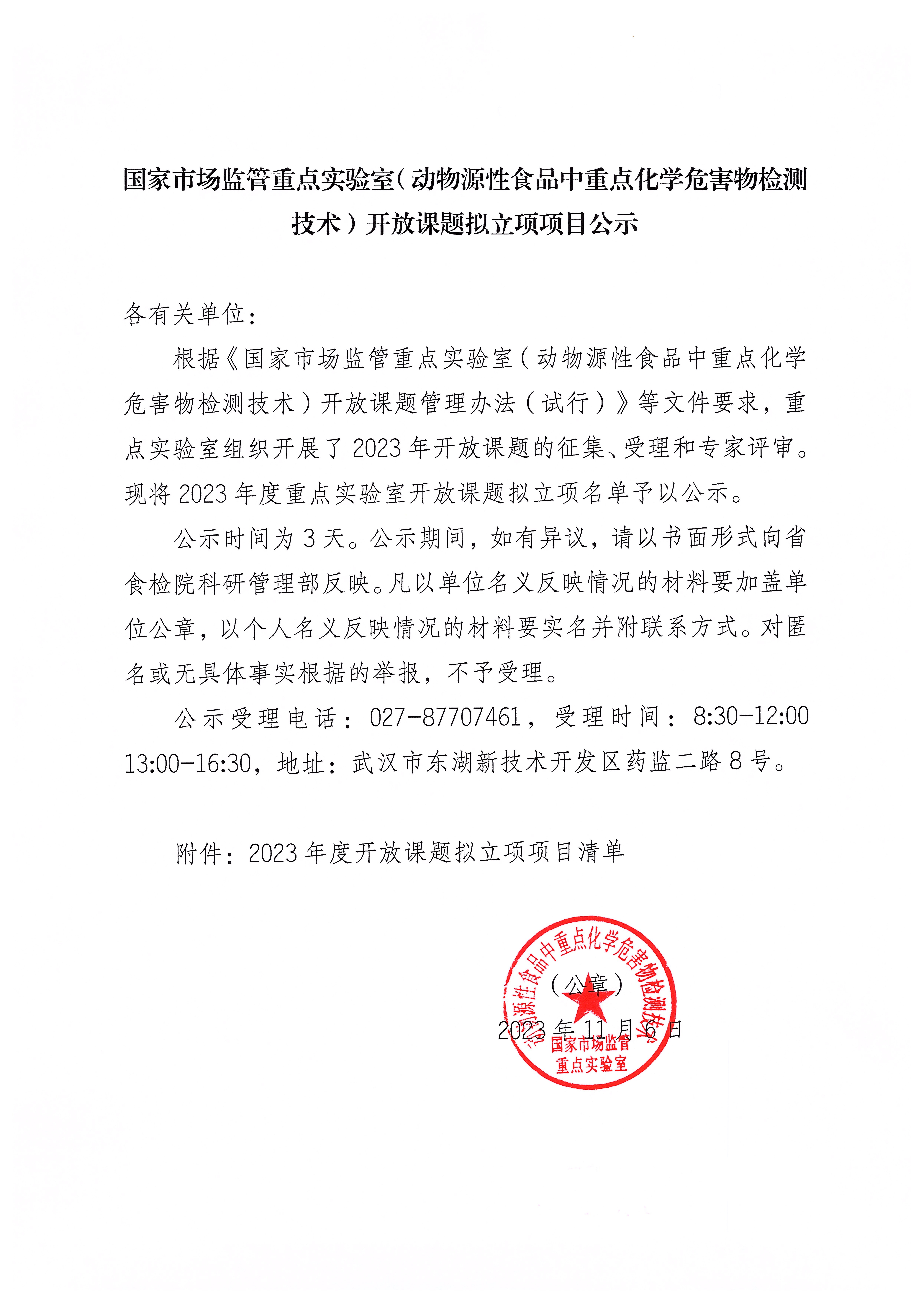 国家市场监管重点实验室(动物源性食品中重点化学危害物检测技术)开放课题拟立项项目公示