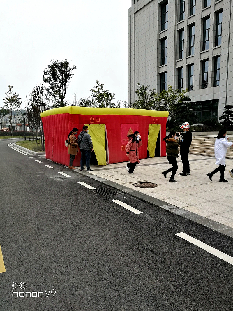 (图二:全院职工正在进行应急疏散演练和逃生屋体验)
