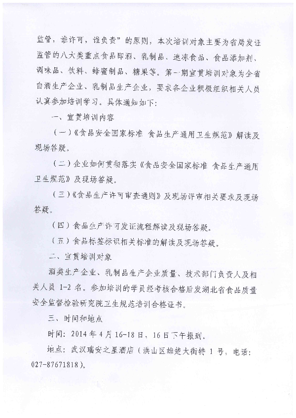 湖北省食品质量安全监督检验研究院关于举办《食品生产通用卫生规范》第一期宣贯培训班的通知
