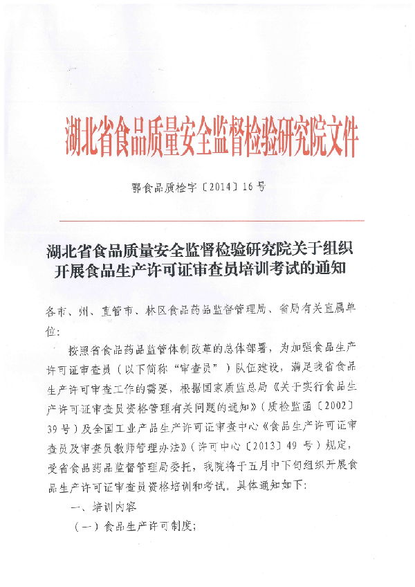 湖北省食品质量安全监督检验研究院关于组织开展食品生产许可证审查员培训考试的通知