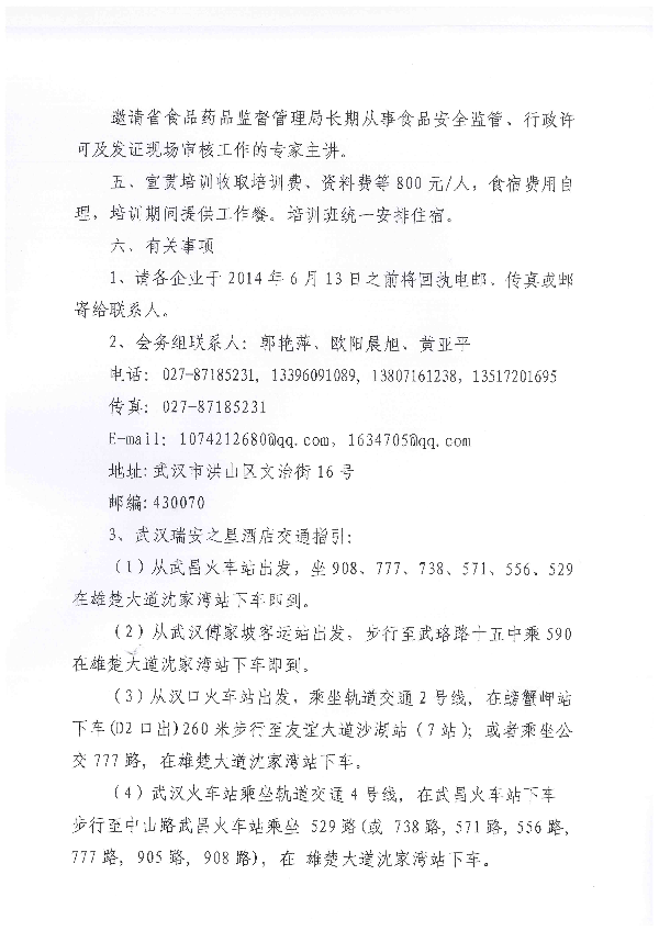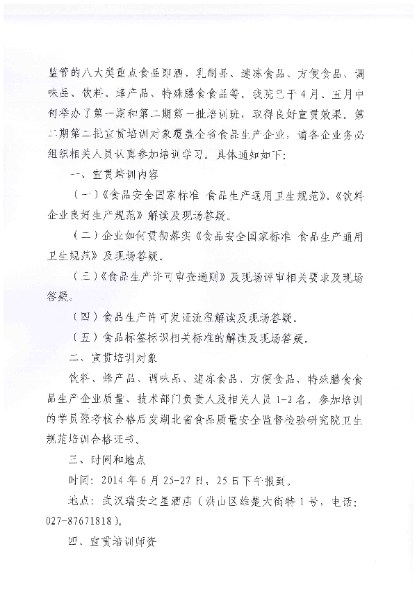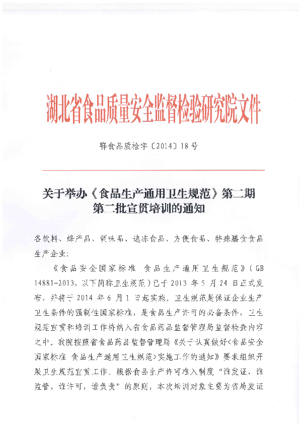 湖北省食品质量安全监督检验研究院关于举办《食品生产通用卫生规范》第二期第二批宣贯培训的通知