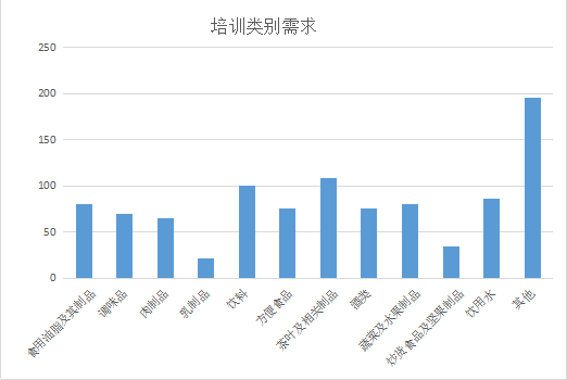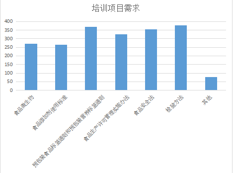 在问卷中列出了食品微生物、食品添加剂使用标准、预包装食品标签通则和预包装营养标签通则、食品生产许可管理实施办法、食品安全法、检验方法、其他等培训项目需求,回收问卷中选择最多的是检验方法,有378人次。其次是预包装食品标签通则和预包装营养标签通则,有370人次。其他类别选择最少,也都没有在括弧内列出具体需求项目。在后面的意见和建议中,有部分企业填写了保质期测试和感官评估。