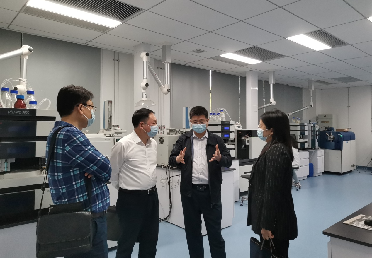 4月28日,省科技厅成果处处长胡安慰在省市场局认检处处长雷慧的陪同下,一行5人赴我院调研建设中试测试服务平台相关工作。省食检院党委书记、院长范志勇陪同来访人员参观了实验室。