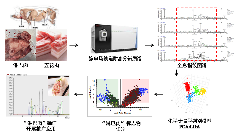 省食检院针对湖北省某地市场监管稽查大队提供的案源和“淋巴肉”样品,组织研究团队开展实地调研和技术研发,集中技术力量和资源解决“淋巴肉”鉴别的技术难题。研究团队运用食品组学技术,初步识别和确证了“淋巴肉”标志物,能够实现“淋巴肉”和正常猪肉样品的区分,该研究工作于2021年11月获批国家市场监管总局科技计划项目《“淋巴肉”标志物识别与确证关键技术研究》(2021MK070)的立项支持,同时获批立项研制国家食品补充检验方法。
