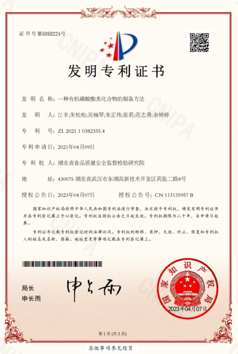 近日,依托十三五国家重点研发计划项目支持,省食检院申请的发明专利“一种有机磷酸酯类化合物的制备方法”(专利号:ZL 2021 1 0382335.4)获国家知识产权局授权。