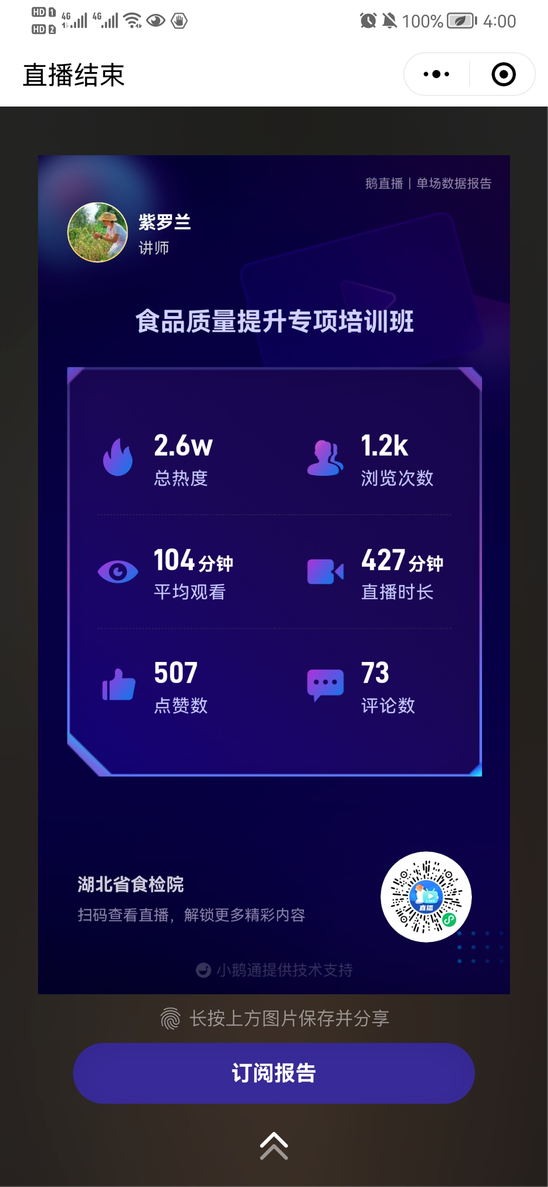 茅箭区武当山茶产业集群、潜江市虾稻产业集群、鄂州市武昌鱼生产加工行业、咸宁饮料产业集群以及其他食品生产企业的质量或技术负责人共402人观看了本次培训直播。