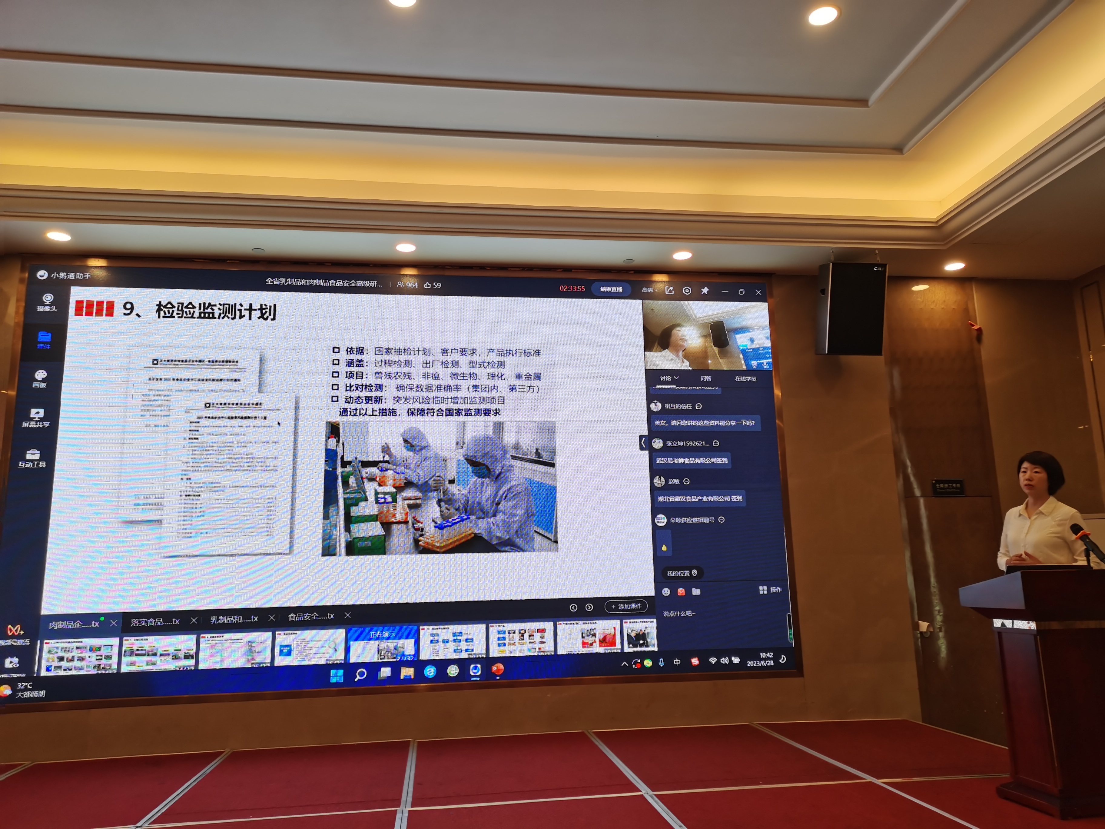 6月27-29日,省食检院举办了全省乳制品和肉制品高级研修班,来自全省各地的一百多家乳制品和肉制品企业的食品安全总监和质量负责人(共120余人)参加了本次研修学习。为满足因名额限制不能参加线下学习的其他企业人员需求,本次研修班同时开展了线上直播,期间直播间访客数达385人,浏览量2059人次。