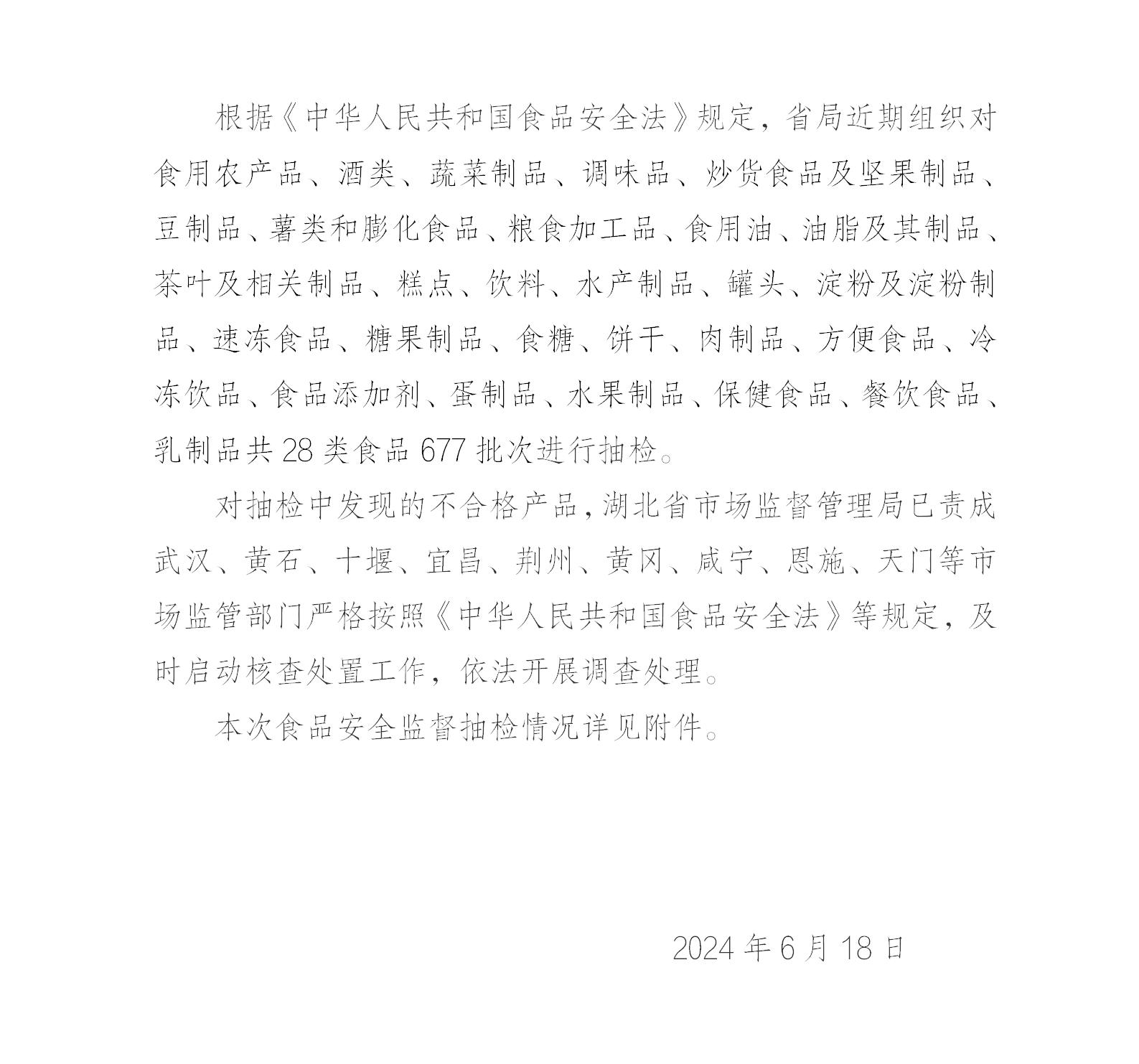 湖北省市场监督管理局 食品安全监督抽检信息公告(2024年第7期)