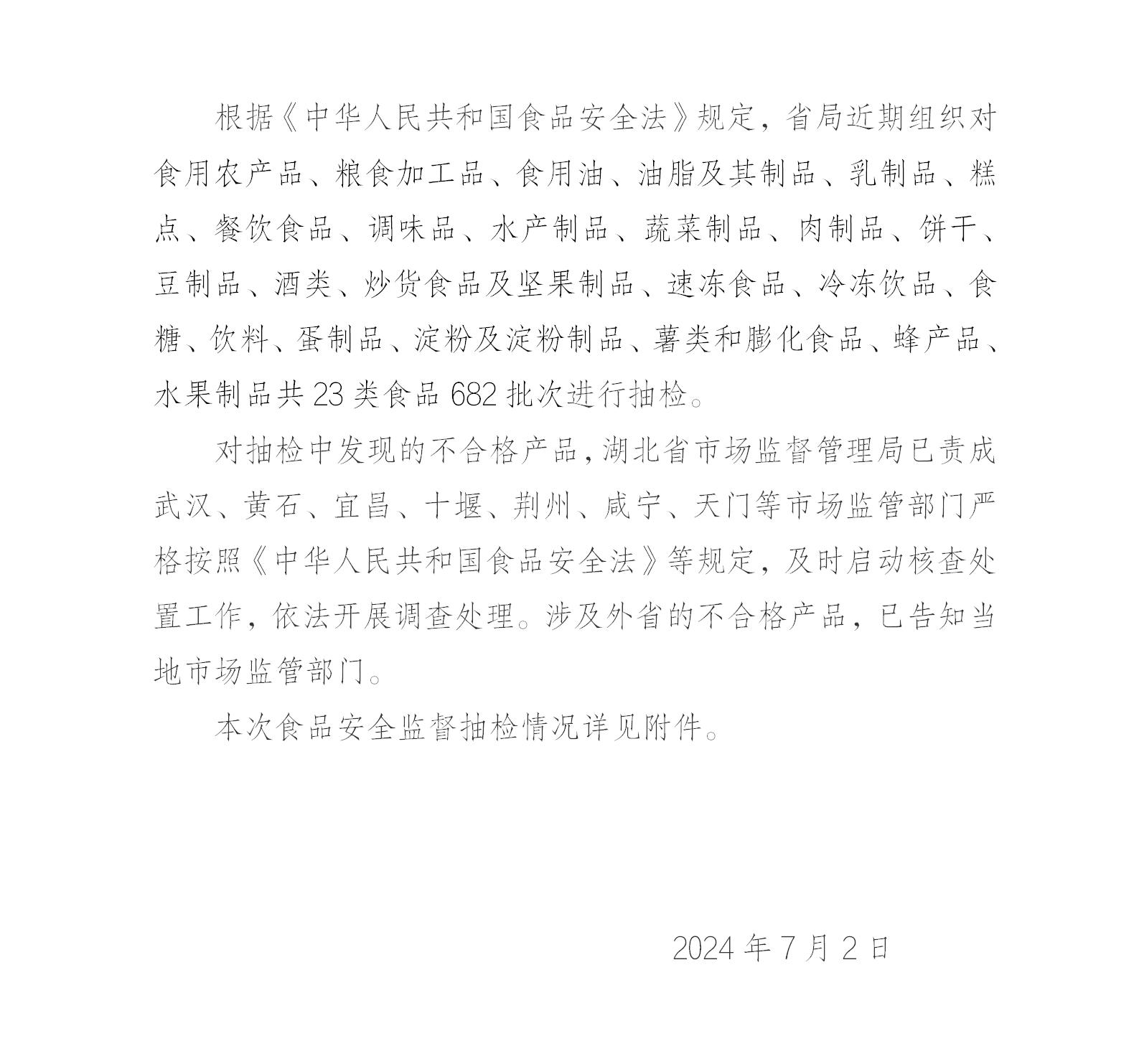 湖北省市场监督管理局 食品安全监督抽检信息公告(2024年第9期)