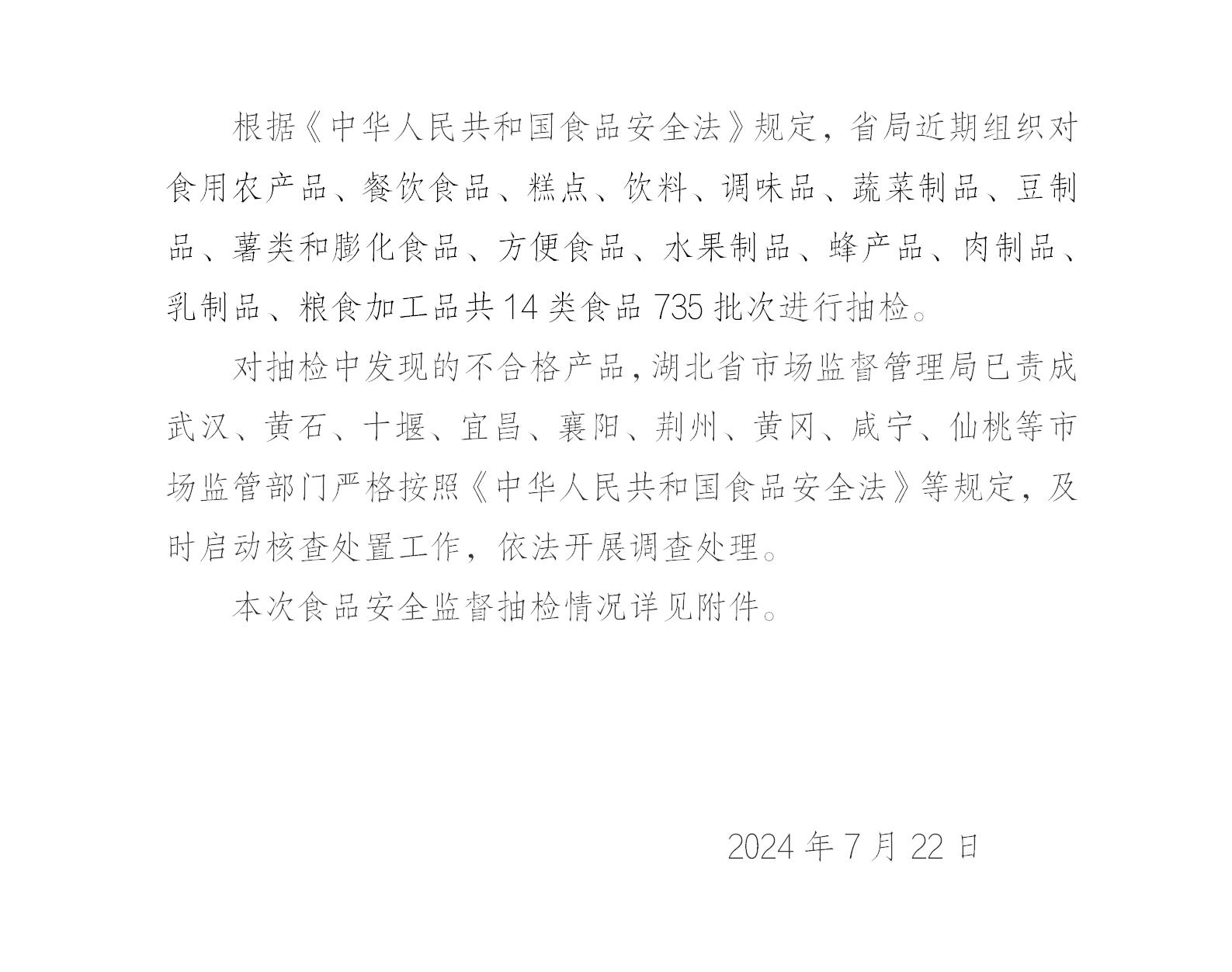 湖北省市场监督管理局 食品安全监督抽检信息公告(2024年第11期)
