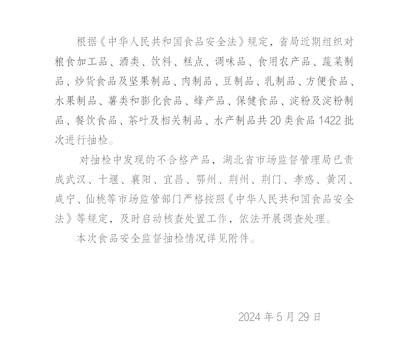 湖北省市场监督管理局 食品安全监督抽检信息公告(2024年第5期)