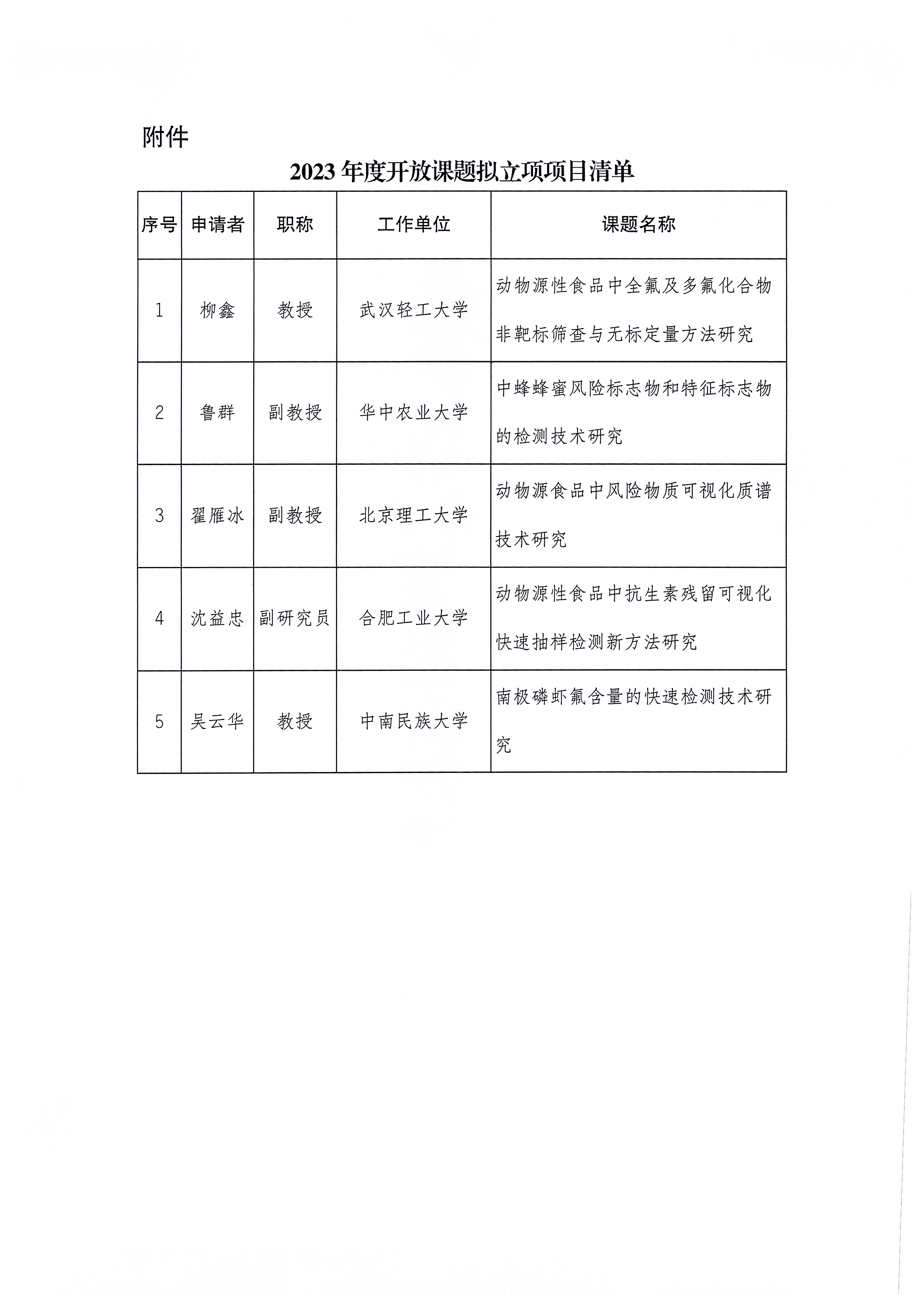 国家市场监管重点实验室(动物源性食品中重点化学危害物检测技术)开放课题拟立项项目公示
